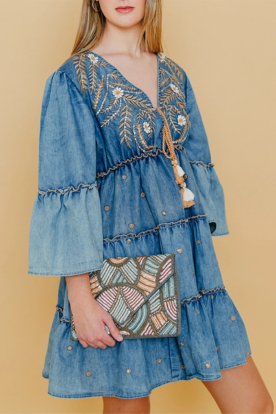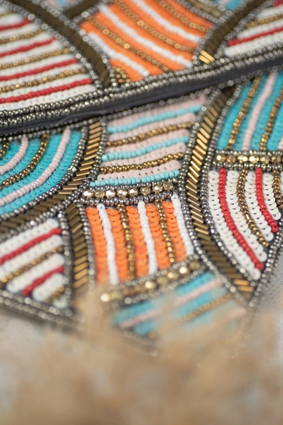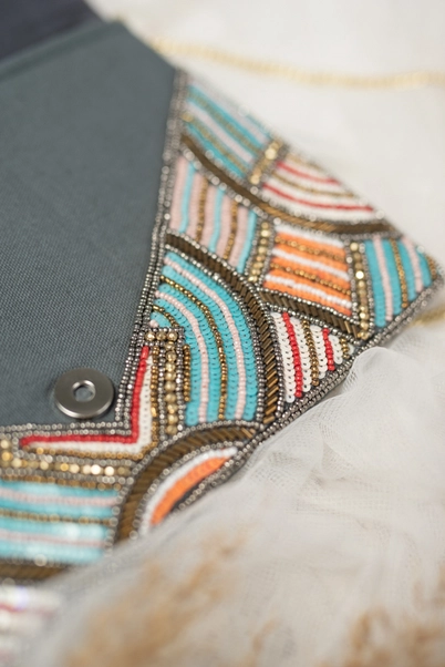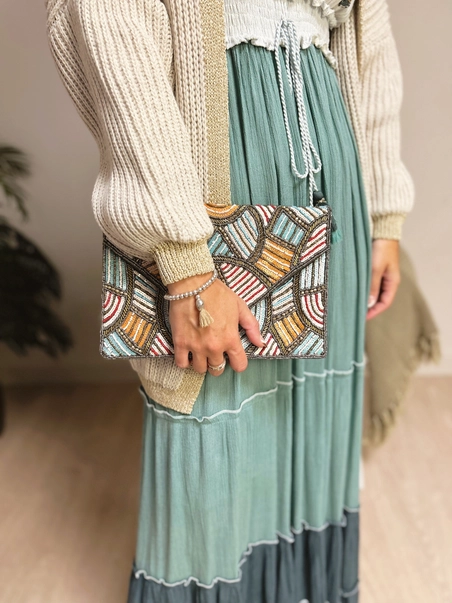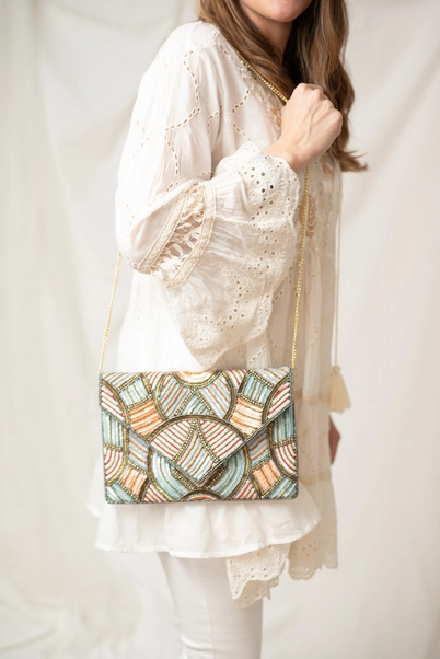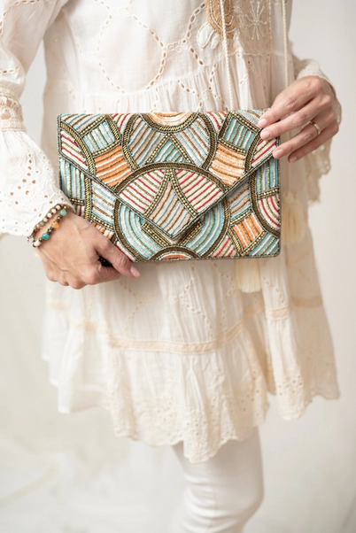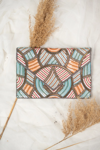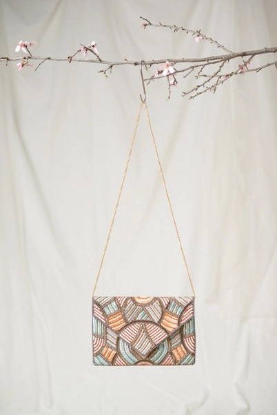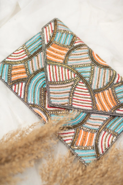 Nightclub bag with embroidery and prints in shades of orange, blue and brown.