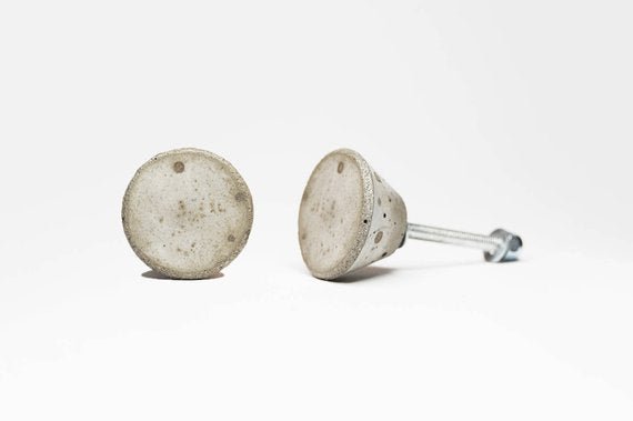 Concrete cabinet knob in the shape of a truncated cone. This is bare concrete with rough sanded edges. Every knob is sealed.