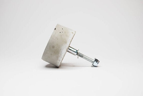 Concrete cabinet knob in the shape of a circle/disc. These knobs are flat and they’re elevated from the drawer front/door by means of two nuts.