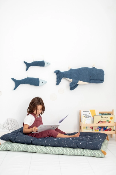 Our Plush Toy Pack to play and decorate consists of 2 beautiful dark blue fish together with a dark blue whale. They have a bell inside to emit a soft sound and 2 wall lights of the same fabric with which you can easily hang them on the wall.