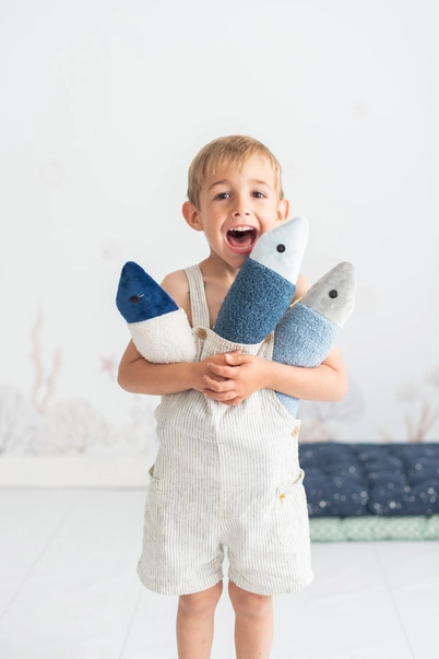 Our dark blue fish pack is made of soft cloth and velvet on the head. It has a bell inside the body and two wall lights on top of the same fabric so that it can be hung and decorated the walls of the children’s rooms. It can also be used to decorate beds or as a soft plush toy. It has a fun design, an elongated body and a fin. A unique Deco Wall element designed to give a special touch to children’s rooms.