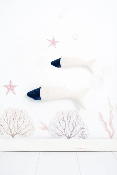 Our white fish pack is made of soft cloth and velvet on the head. It has a bell inside the body and two wall lights on top of the same fabric so that it can be hung and decorated the walls of the children’s rooms. It can also be used to decorate beds or as a soft plush toy. It has a fun design, an elongated body and a fin. A unique Deco Wall element designed to give a special touch to children’s rooms.