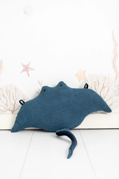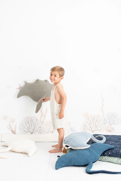 Our dark blue manta ray is made of soft rye fabric on the front and velvet on the back. It has a bell inside the body and two rear wall lights in the same fabric so that it can be hung and decorated the walls of the children’s rooms. It can also be used to decorate beds or as a soft plush toy. It has a fun fish-shaped design and big fins. A unique Deco Wall element designed to give a special touch to children’s rooms.