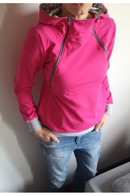 You can wear such a hoodie not only when you are breastfeeding – the system of zip fasteners is practical and decorative at the same time, which makes the hoodie very universal. At first glance, it is hard to tell what these clever zip fasteners are for. The system of zip fasteners guarantees easy and discreet nursing.