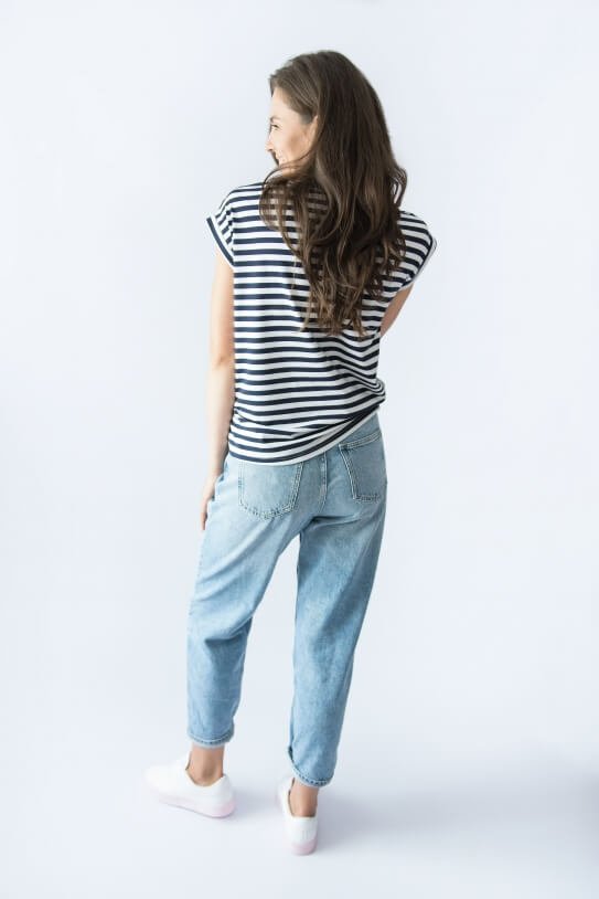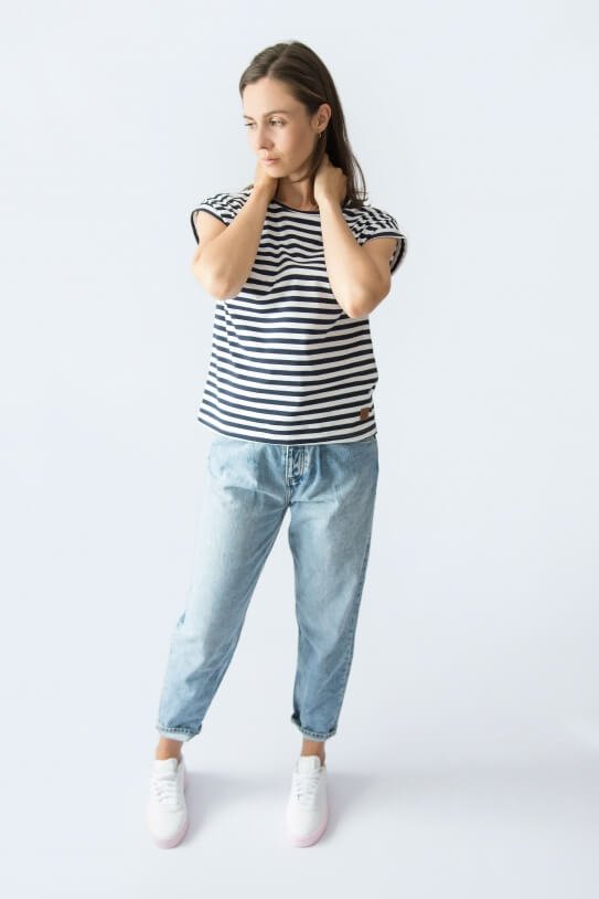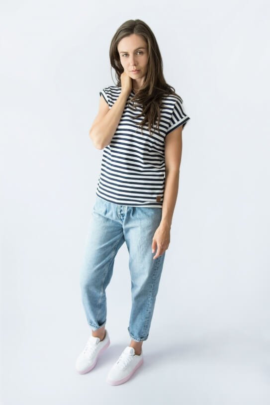 Combining a simple pattern with a classic black & white stripe allows it to be used for many stylings. If you want to keep it slacker, wear it with leggings and classic sneakers. Do you want more style and elegance? All you have to do is change the leggings to black jeans and put on high heels.