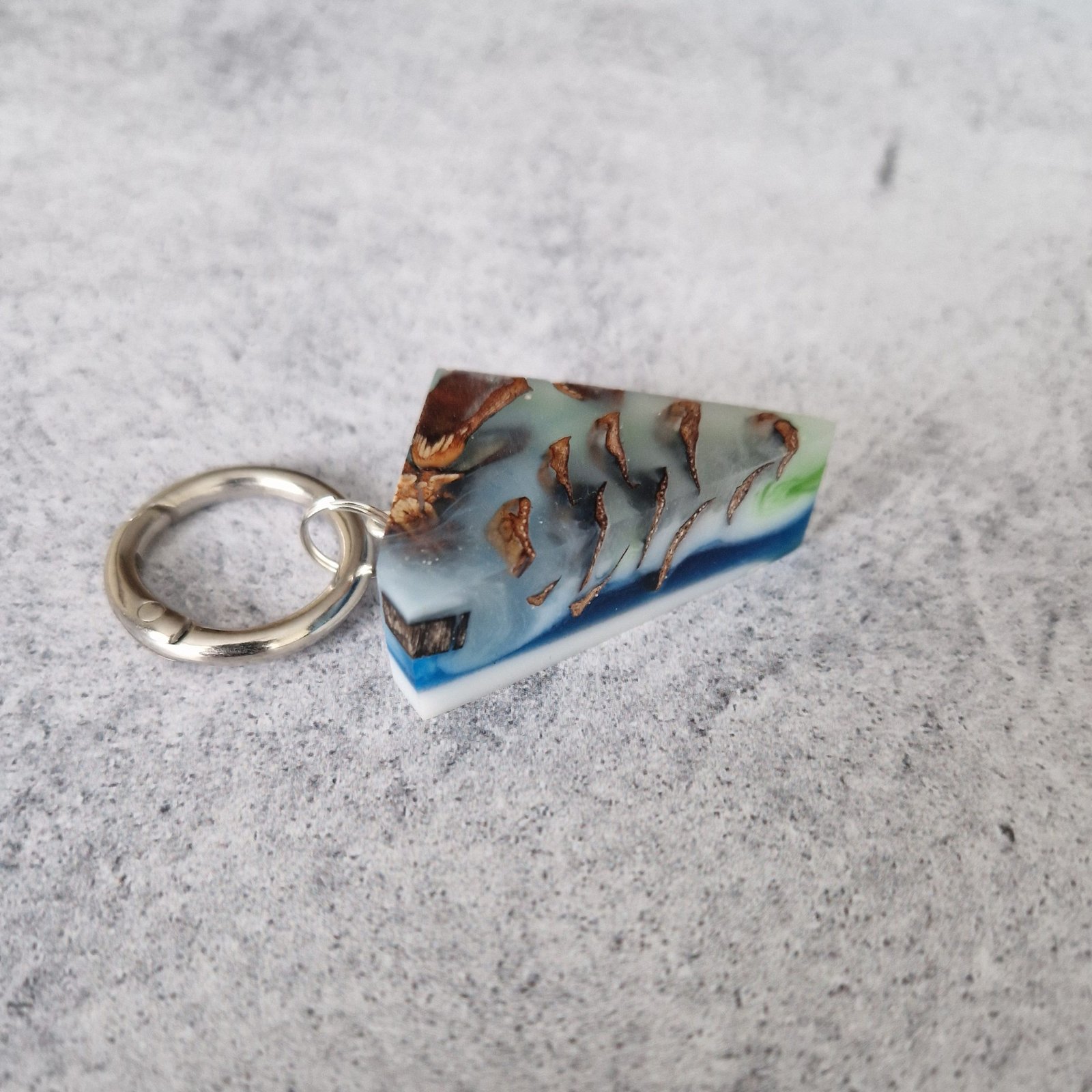 This keychain was created using epoxy resin and pine cone details found in nature.