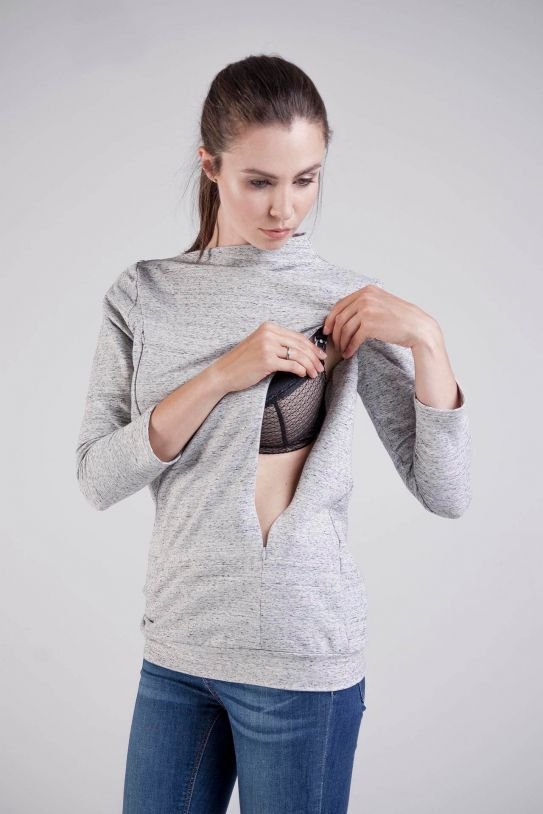 The stand-up collar blouse made of melange fabric is the perfect solution for breastfeeding mothers. Two zippers on the sides allow for discrete breast exposure and quick-latching the toddler when he gets hungry. Thanks to this solution you do not have to undress to feed the baby.